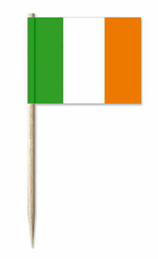 Die Cocktail Papier-Fähnchen Irland sind an einem Zahnstocher befestigt. Die Irland Mini-Fahnen sind hygienisch in einem Beutel verpackt. Selbstverständlich sind die Irland Zahnstocher-Fähnchen beidseitig bedruckt