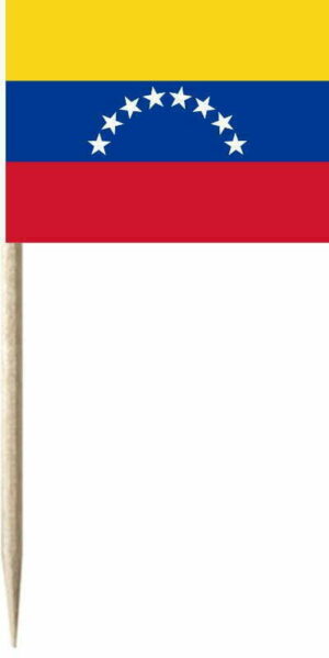 Die Cocktail Papier-Fähnchen Venezuela sind an einem Zahnstocher befestigt. Die Venezuela Mini-Fahnen sind hygienisch in einem Beutel verpackt. Selbstverständlich sind die Venezuela Zahnstocher-Fähnchen beidseitig bedruckt.