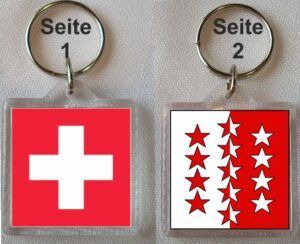 Dieser Schlüsselanhänger Wallis / Schweiz, macht Ihren Schlüsselbund zum echten Blickfang. Die „Fahne“ der Schweiz und vom Wallis haben eine Grösse von ca. 34 x 34 mm.