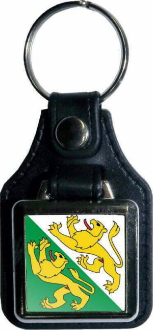 Dieser schöne Schlüsselanhänger Thurgau ist aus einer Kombination von Kunstleder und Metall gefertigt. Auf der der Vorderseite mit einer quadratischen Fahne von Thurgau und auf der hinteren Seite ist der Anhänger mit einer edlen Lasche aus Kunstleder versehen. So haben Sie Ihre Schlüssel immer schön im Griff. Da die Rückseite etwas grösser ist als die matallige Seite mit dem Wappen, sieht man einen schönen Rand um den Anhänger.